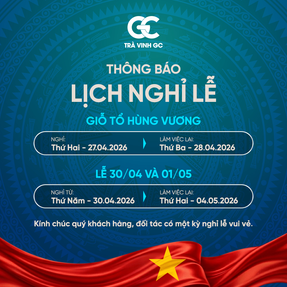 Công ty Cổ phần Xây dựng Trà Vinh GC (TVGC) trân trọng thông báo đến Quý Khách hàng và Quý Đối tác về lịch nghỉ lễ Giỗ Tổ Hùng Vương, Ngày Giải phóng miền Nam (30/04) và Quốc tế Lao động (01/05) năm 2026 như sau: